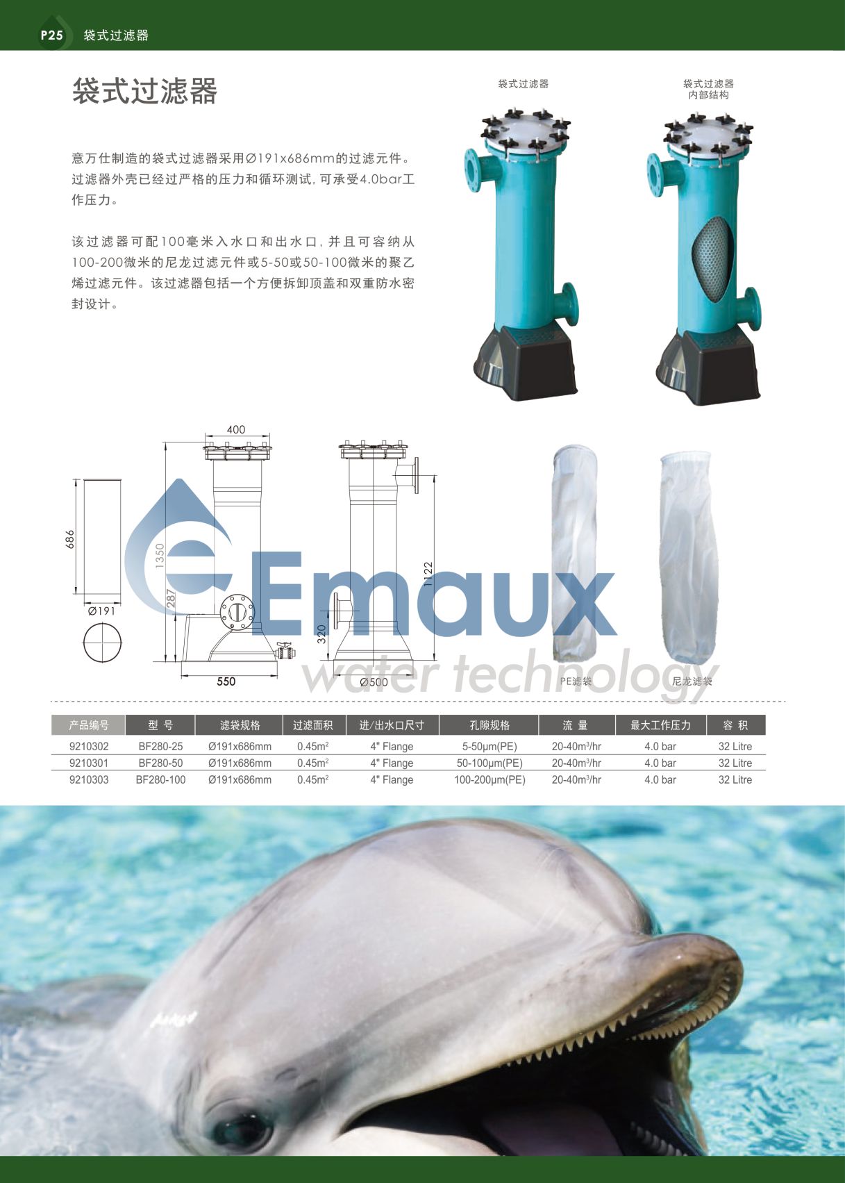 意萬仕制造的袋式過濾器采用0191x686mm的過濾元件。過濾器外殼已經過嚴格的壓力和循環測試,可承受4.0bar工作壓力。 該過濾器可配100毫米入水口和出水口, 并且可容納從100-200微米的尼龍過濾元件或5-50或50-100微米的聚乙烯過濾元件。該過濾器包括一個方便拆卸頂蓋和雙重防水密封設計。