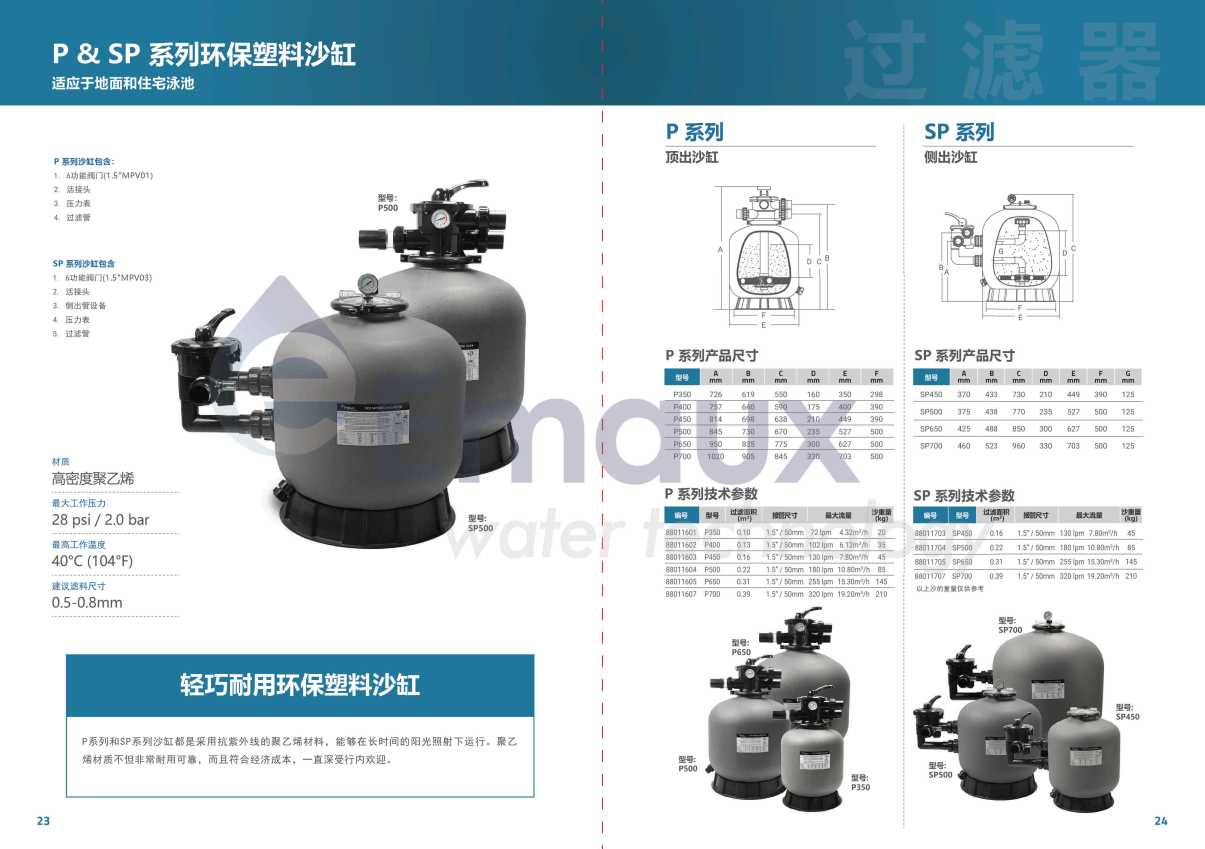 P系列和SP系列沙缸都是采用抗紫外線的聚乙烯材料,能夠在長時間的陽光照射下運行。聚乙烯材質不但非常耐用可靠,而且符合經濟成本,一直深受行內歡迎。