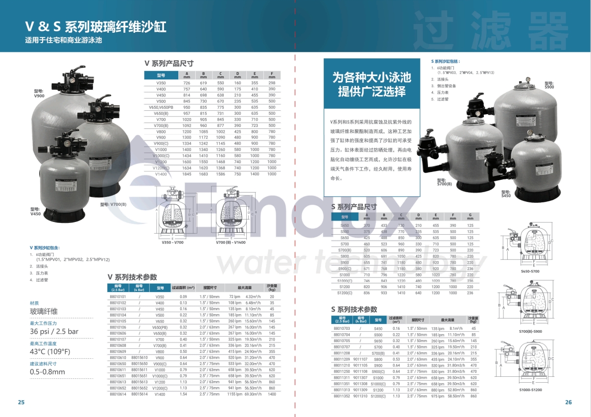 V系列和S系列采用抗腐蝕及抗紫外線的玻璃纖維和聚酯制造而成,這種工藝加強了缸體的強度和提高了沙缸的可承受壓力。缸體表面經過防曬處理,再由電腦化自動纏繞工藝而成,允許沙缸在極端天氣條件下工作,經久耐用,使用壽命長。
