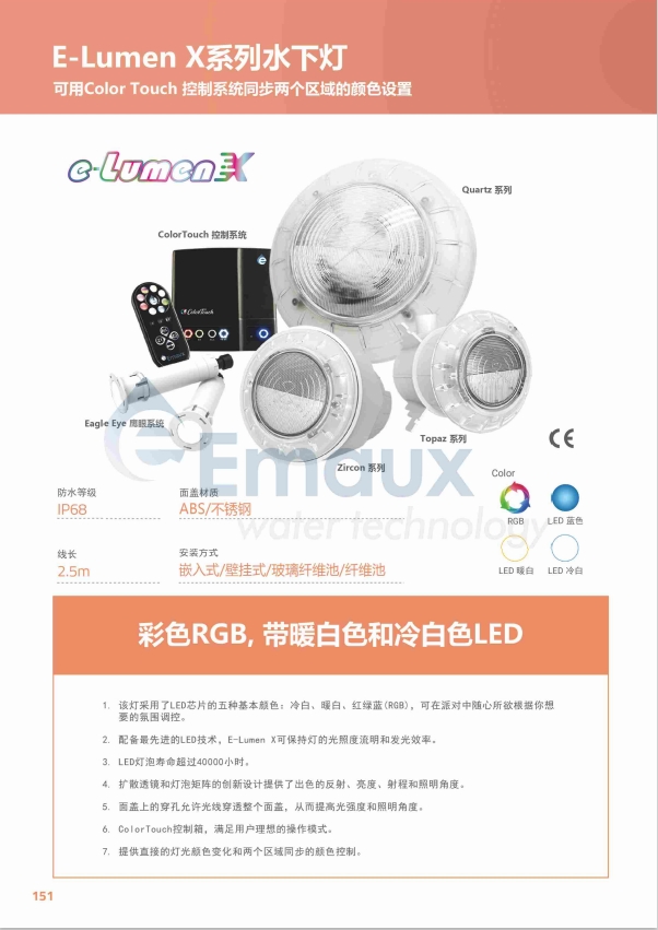 1. 該燈采用了LED芯片的五種基本顏色:冷白、暖白、紅綠藍(RGB), 可在派對中隨心所欲根據你想要的氛圍調控。 2. 配備最先進的LED技術,E-Lumen X可保持燈的光照度流明和發光效率。 3. LED燈泡壽命超過40000小時。 4. 擴散透鏡和燈泡矩陣的創新設計提供了出色的反射、亮度、射程和照明角度。 5. 面蓋上的穿孔允許光線穿透整個面蓋,從而提高光強度和照明角度。 6. ColorTouch控制箱,滿足用戶理想的操作模式。