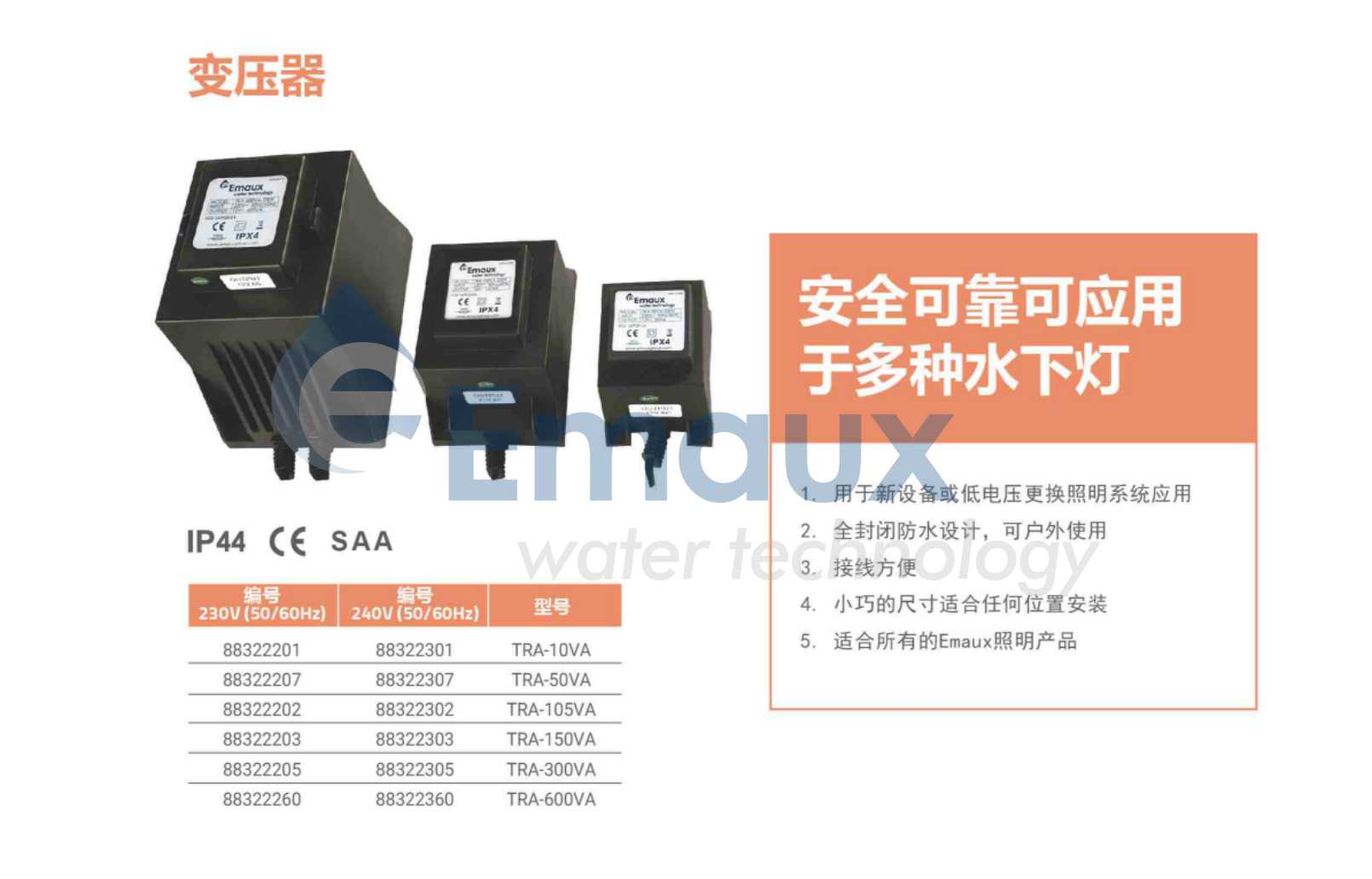 1. 用于新設備或低電壓更換照明系統應用 2. 全封閉防水設計,可戶外使用 3. 接線方便 4. 小巧的尺寸適合任何位置安裝 5. 適合所有的Emaux照明產品