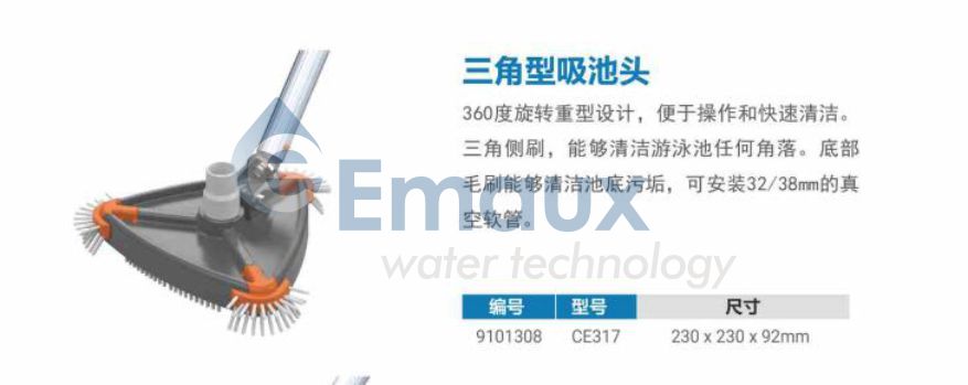 360度旋轉重型設計,便于操作和快速清潔。三角側刷,能夠清潔游泳池任何角落。底部毛刷能夠清潔池底污垢,可安裝32/38mm的真空軟管。
