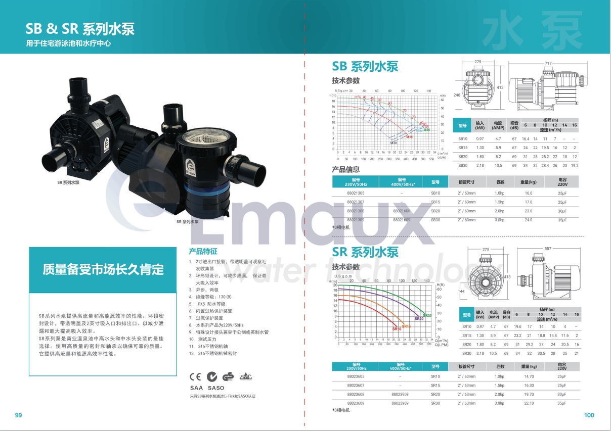 SB系列水泵提供高流量和高能源效率的性能。環鎖密封設計,帶透明蓋及2英寸吸入口和排出口。以減少泄漏和最大提高吸入效率。 SR系列泵是商業溫泉池中高水頭和中水頭安裝的最佳選擇。使用高質量的密封和軸承以確??煽康馁|量。它提供高流量和能源高效率性能。