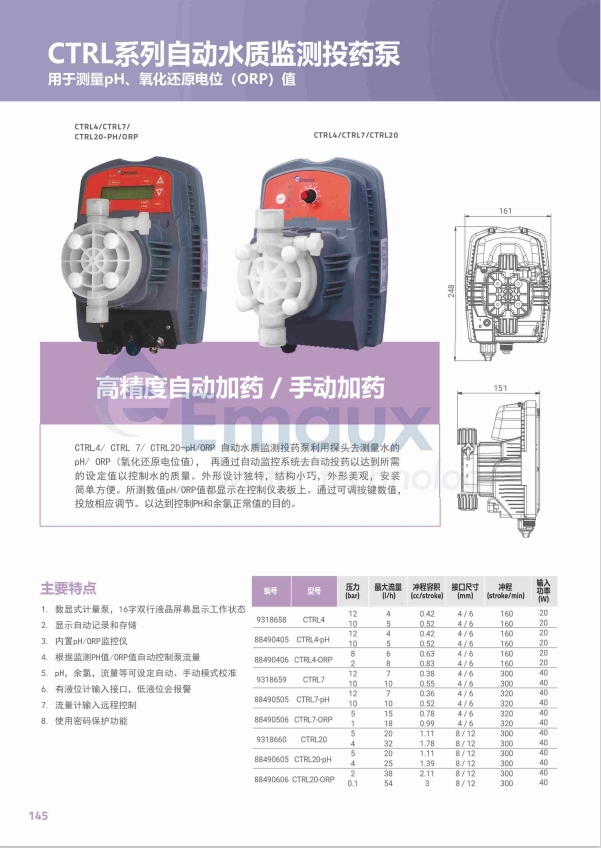 CTRL4/ CTRL 7/ CTRL20-PH/ORP 自動水質監測投藥泵利用探頭去測量水的PH/ ORP (氧化還原電位值), 再通過自動監控系統去自動投藥以達到所需的設定值以控制水的質量。外形設計獨特,結構小巧,外形美觀,安裝簡單方便。所測數值PH/ORP值都顯示在控制儀表板上。通過可調按鍵數值,投放相應調節。液達到控制PH和余氯正常值的目的。