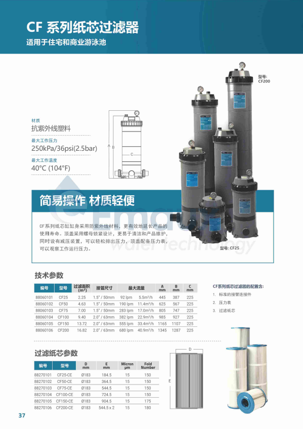 CF系列紙芯缸缸身采用防紫外線材料,更有效地延長產品的使用壽命。頂蓋采用螺母鎖緊設計,更易于清潔和產品維護,同時設有減壓裝置,可以輕松排出壓力,頂蓋配備壓力表,可以觀察工作運行壓力