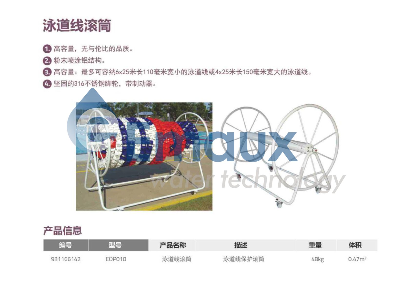 3. 高容量:最多可容納6x25米長110毫米寬小的泳道線或4x25米長150毫米寬大的泳道線。